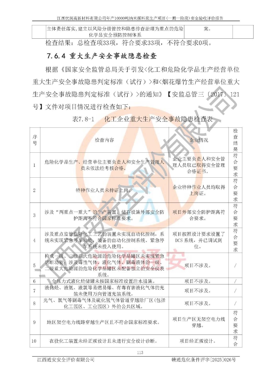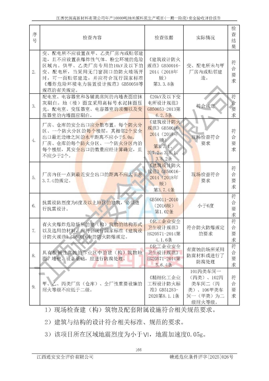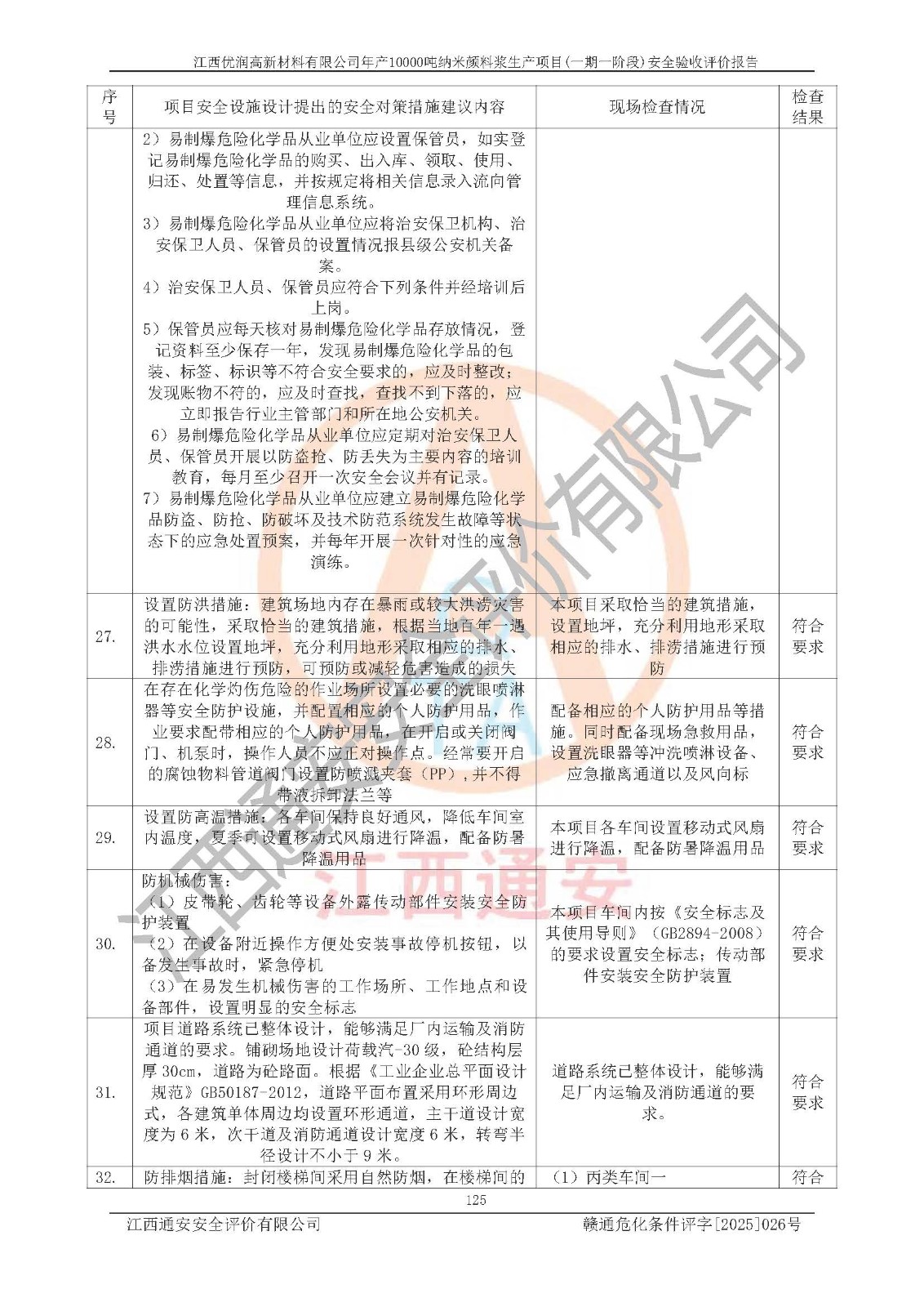 評(píng)價(jià)結(jié)論 | 1、江西優(yōu)潤(rùn)高新材料有限公司年產(chǎn)10000噸納米顏料漿生產(chǎn)項(xiàng)目(一期一階段)(1500t/a水性鋁顏料漿、500t/a樹(shù)脂包覆鋁顏料漿、1000t/a水性納米無(wú)機(jī)顏料漿、200t/a油性納米無(wú)機(jī)顏料漿、200t/a油性納米有機(jī)顏料漿、400t/a水性消泡劑、300t/a水性增稠劑)的安全設(shè)施與主體工程同時(shí)設(shè)計(jì)、同時(shí)施工、同時(shí)投入使用,符合**有關(guān)建設(shè)項(xiàng)目“三同時(shí)”的規(guī)定和要求。 2、江西優(yōu)潤(rùn)高新材料有限公司年產(chǎn)10000噸納米顏料漿生產(chǎn)項(xiàng)目(一期一階段)(1500t/a水性鋁顏料漿、500t/a樹(shù)脂包覆鋁顏料漿、1000t/a水性納米無(wú)機(jī)顏料漿、200t/a油性納米無(wú)機(jī)顏料漿、200t/a油性納米有機(jī)顏料漿、400t/a水性消泡劑、300t/a水性增稠劑)等主體工程安全設(shè)施、安全措施基本符合法律法規(guī)的規(guī)定和要求,并運(yùn)行**;公用工程及輔助設(shè)施滿(mǎn)足主體工程生產(chǎn)安全的需要;企業(yè)安全管理體系滿(mǎn)足生產(chǎn)安全的要求。 3、江西優(yōu)潤(rùn)高新材料有限公司已針對(duì)本報(bào)告提出的安全隱患整改意見(jiàn)組織人員進(jìn)行整改,經(jīng)過(guò)整改已落實(shí)到位,企業(yè)安全生產(chǎn)的風(fēng)險(xiǎn)控制在可以接受的范圍內(nèi)。 綜上所述江西優(yōu)潤(rùn)高新材料有限公司年產(chǎn)10000噸納米顏料漿生產(chǎn)項(xiàng)目(一期一階段)(1500t/a水性鋁顏料漿、500t/a樹(shù)脂包覆鋁顏料漿、1000t/a水性納米無(wú)機(jī)顏料漿、200t/a油性納米無(wú)機(jī)顏料漿、200t/a油性納米有機(jī)顏料漿、400t/a水性消泡劑、300t/a水性增稠劑)等主體工程及相關(guān)配套的設(shè)備和安全設(shè)施運(yùn)行正常,企業(yè)安全管理機(jī)制運(yùn)行正常,安全設(shè)施、措施達(dá)到規(guī)范要求和預(yù)期結(jié)果,可以滿(mǎn)足項(xiàng)目安全生產(chǎn)的要求,安全管理**,該項(xiàng)目具備安全設(shè)施竣工驗(yàn)收條件。 | |||