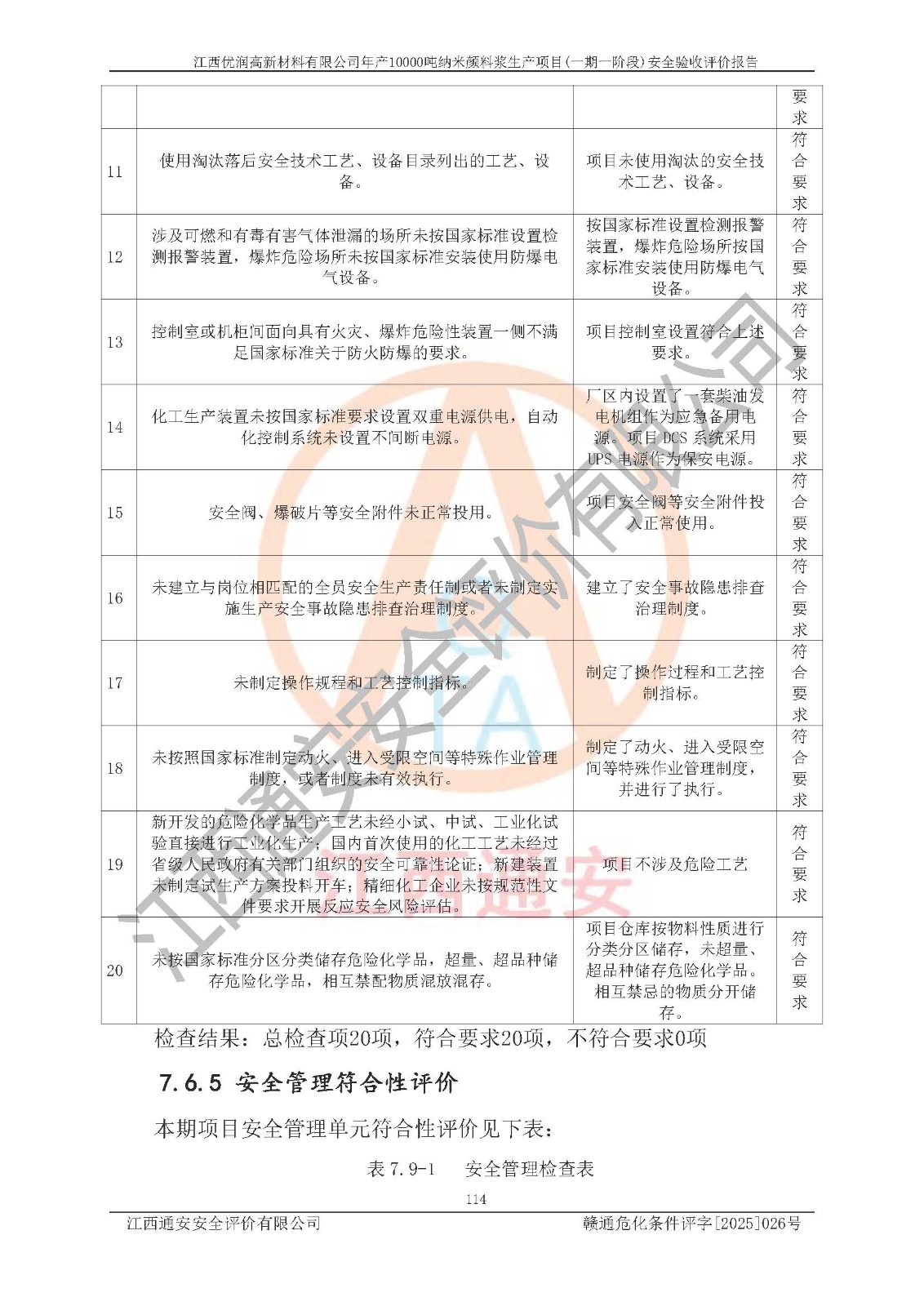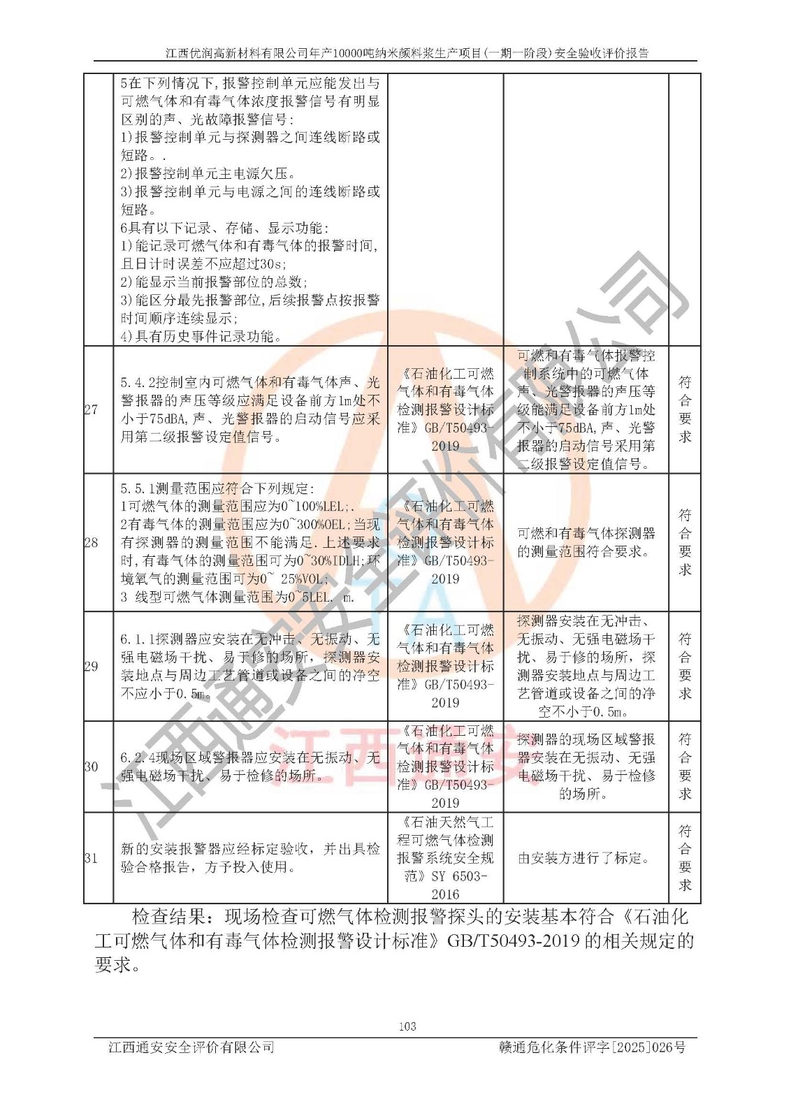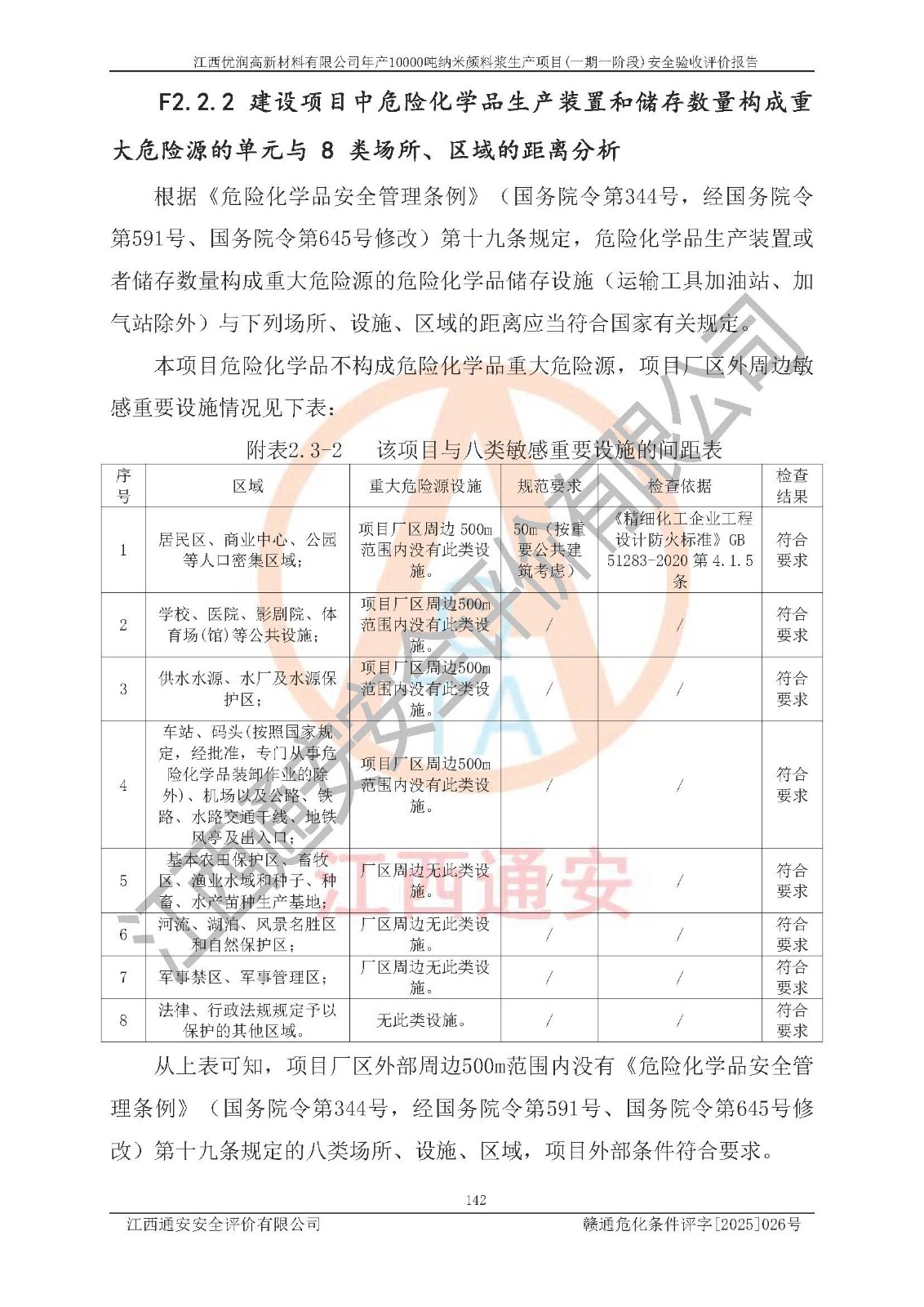 評(píng)價(jià)結(jié)論 | 1、江西優(yōu)潤(rùn)高新材料有限公司年產(chǎn)10000噸納米顏料漿生產(chǎn)項(xiàng)目(一期一階段)(1500t/a水性鋁顏料漿、500t/a樹(shù)脂包覆鋁顏料漿、1000t/a水性納米無(wú)機(jī)顏料漿、200t/a油性納米無(wú)機(jī)顏料漿、200t/a油性納米有機(jī)顏料漿、400t/a水性消泡劑、300t/a水性增稠劑)的安全設(shè)施與主體工程同時(shí)設(shè)計(jì)、同時(shí)施工、同時(shí)投入使用,符合**有關(guān)建設(shè)項(xiàng)目“三同時(shí)”的規(guī)定和要求。 2、江西優(yōu)潤(rùn)高新材料有限公司年產(chǎn)10000噸納米顏料漿生產(chǎn)項(xiàng)目(一期一階段)(1500t/a水性鋁顏料漿、500t/a樹(shù)脂包覆鋁顏料漿、1000t/a水性納米無(wú)機(jī)顏料漿、200t/a油性納米無(wú)機(jī)顏料漿、200t/a油性納米有機(jī)顏料漿、400t/a水性消泡劑、300t/a水性增稠劑)等主體工程安全設(shè)施、安全措施基本符合法律法規(guī)的規(guī)定和要求,并運(yùn)行**;公用工程及輔助設(shè)施滿(mǎn)足主體工程生產(chǎn)安全的需要;企業(yè)安全管理體系滿(mǎn)足生產(chǎn)安全的要求。 3、江西優(yōu)潤(rùn)高新材料有限公司已針對(duì)本報(bào)告提出的安全隱患整改意見(jiàn)組織人員進(jìn)行整改,經(jīng)過(guò)整改已落實(shí)到位,企業(yè)安全生產(chǎn)的風(fēng)險(xiǎn)控制在可以接受的范圍內(nèi)。 綜上所述江西優(yōu)潤(rùn)高新材料有限公司年產(chǎn)10000噸納米顏料漿生產(chǎn)項(xiàng)目(一期一階段)(1500t/a水性鋁顏料漿、500t/a樹(shù)脂包覆鋁顏料漿、1000t/a水性納米無(wú)機(jī)顏料漿、200t/a油性納米無(wú)機(jī)顏料漿、200t/a油性納米有機(jī)顏料漿、400t/a水性消泡劑、300t/a水性增稠劑)等主體工程及相關(guān)配套的設(shè)備和安全設(shè)施運(yùn)行正常,企業(yè)安全管理機(jī)制運(yùn)行正常,安全設(shè)施、措施達(dá)到規(guī)范要求和預(yù)期結(jié)果,可以滿(mǎn)足項(xiàng)目安全生產(chǎn)的要求,安全管理**,該項(xiàng)目具備安全設(shè)施竣工驗(yàn)收條件。 | |||