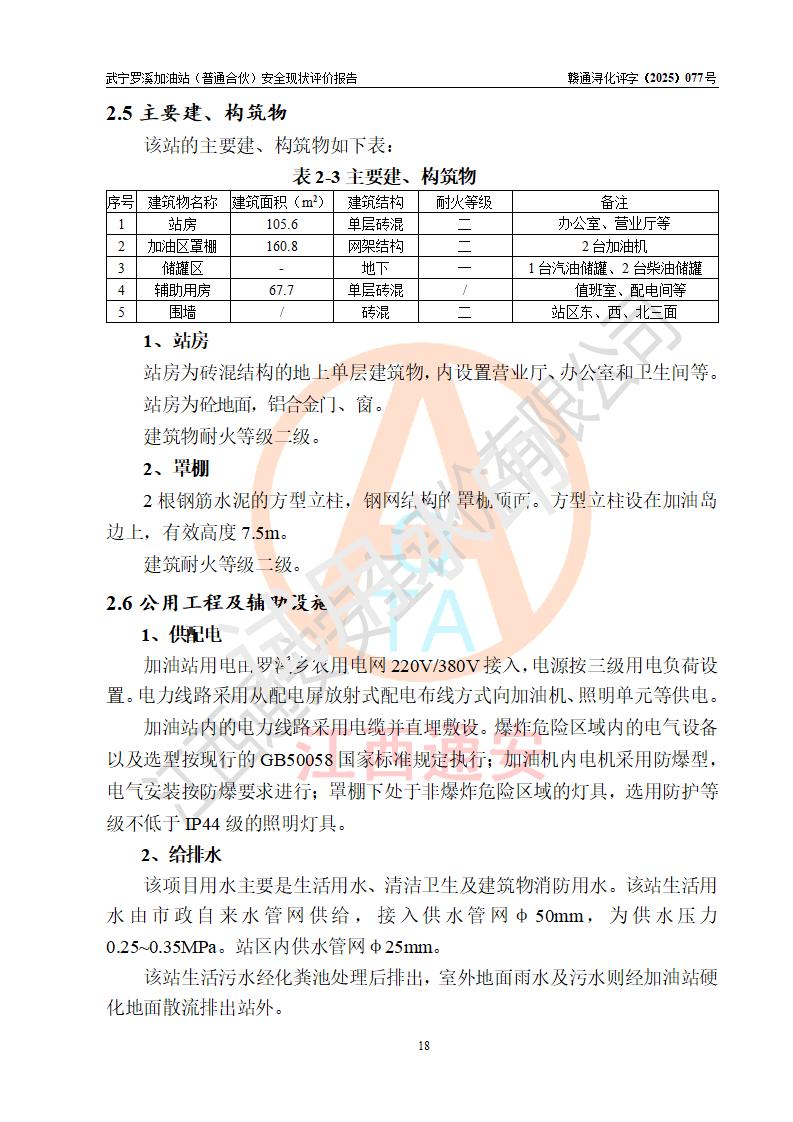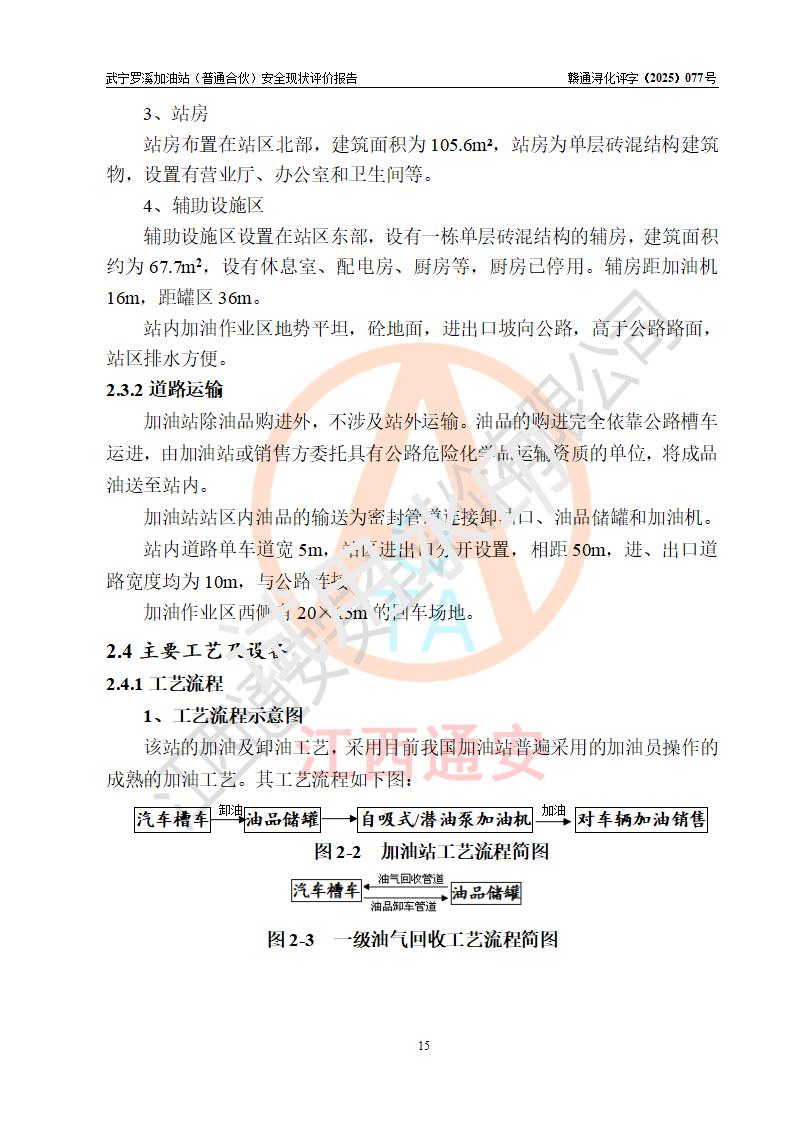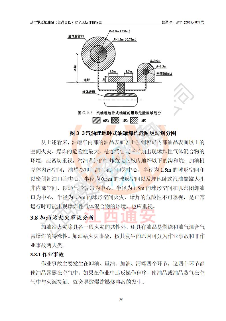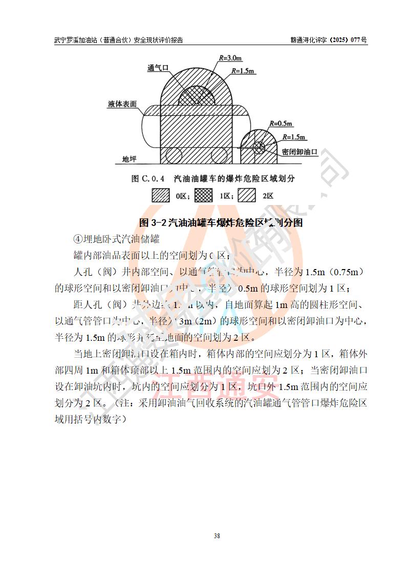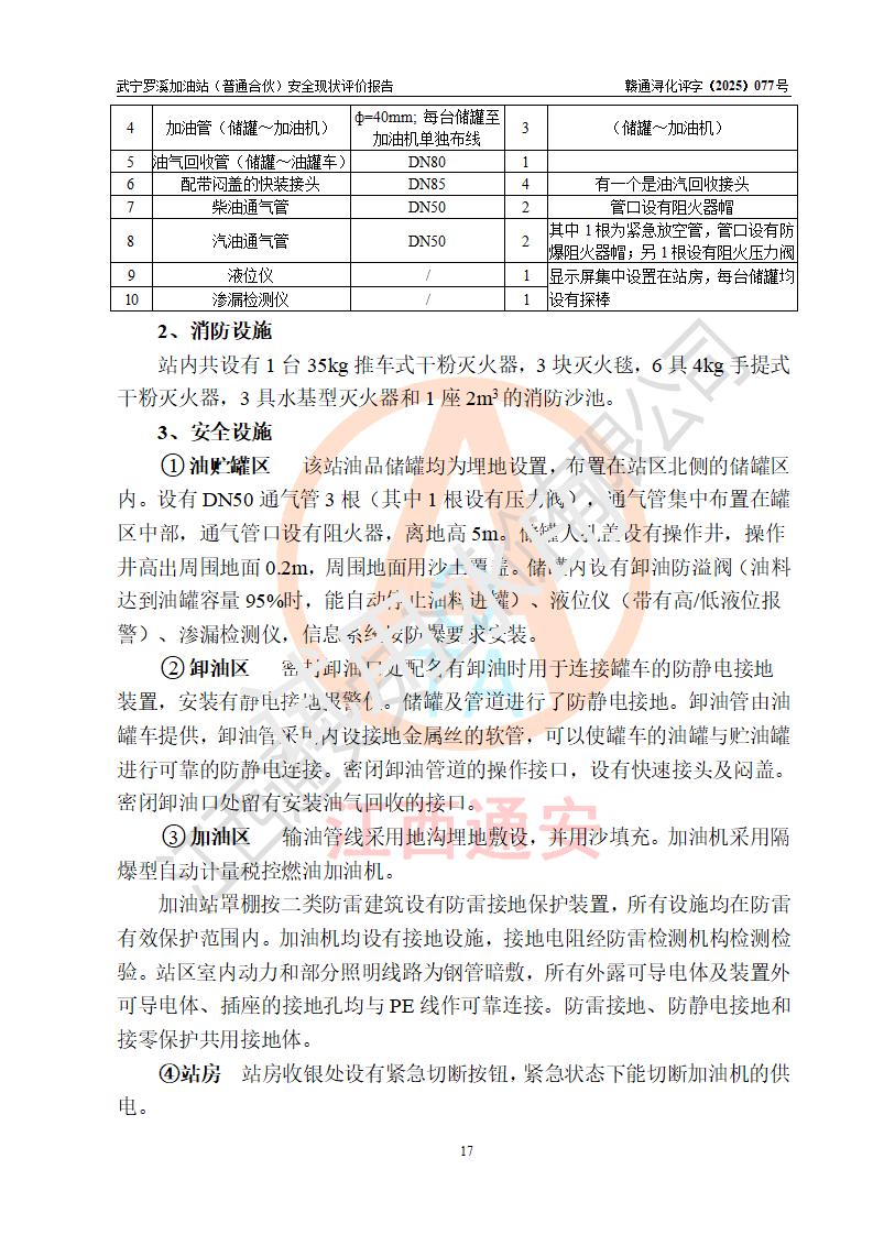 項(xiàng)目簡(jiǎn)介 | 武寧羅溪加油站(普通合伙)是一家專門從事成品油零售經(jīng)營(yíng)的普通合伙企業(yè),經(jīng)營(yíng)場(chǎng)所位于江西省九江市武寧縣羅溪集鎮(zhèn)南側(cè)?,F(xiàn)有從業(yè)人員6名,其中安全管理人員1人,加油站負(fù)責(zé)人王智勇。 該加油站占地面積約2138.6m2,站區(qū)內(nèi)設(shè)置有2臺(tái)雙槍程控燃油加油機(jī)及配套的工藝管線、設(shè)有SF雙層儲(chǔ)罐3臺(tái),其中50m3的0#柴油儲(chǔ)罐2臺(tái)、30m3的92#汽油儲(chǔ)罐1臺(tái),油品儲(chǔ)罐總?cè)莘e為130m3(折算成汽油為80m3),按現(xiàn)行《汽車加油加氣加氫站技術(shù)標(biāo)準(zhǔn)》對(duì)加油站的等級(jí)劃分原則,屬三級(jí)加油站。 該站由九江市行政審批局換發(fā)《危險(xiǎn)化學(xué)品經(jīng)營(yíng)許可證》(證號(hào):贛九行審經(jīng)(甲)字[2022]0000180號(hào)),**期限2022年12月01日至2025年11月30日。 | |||