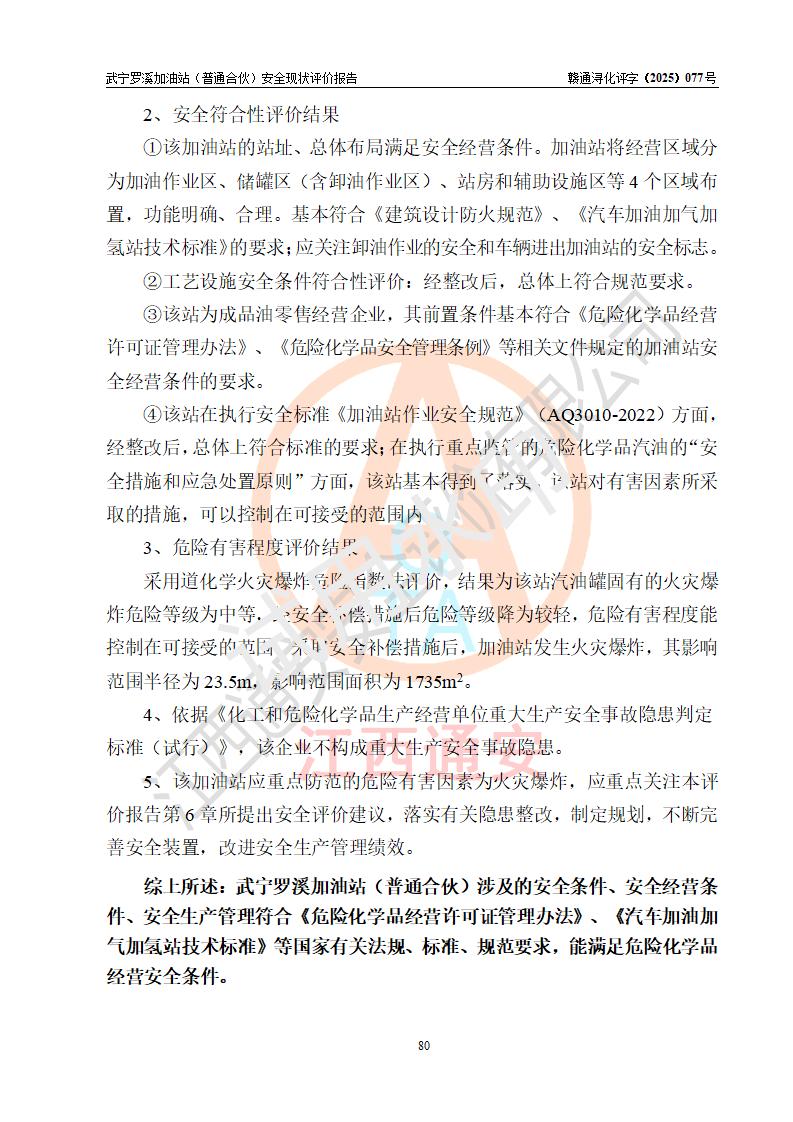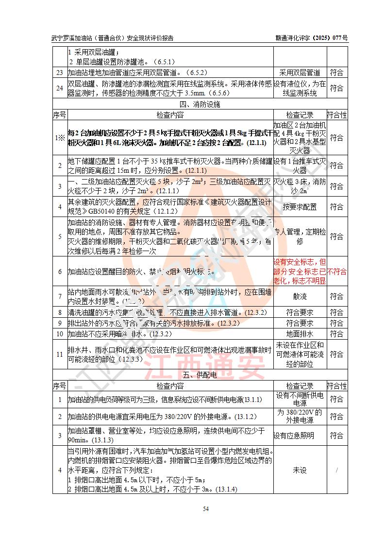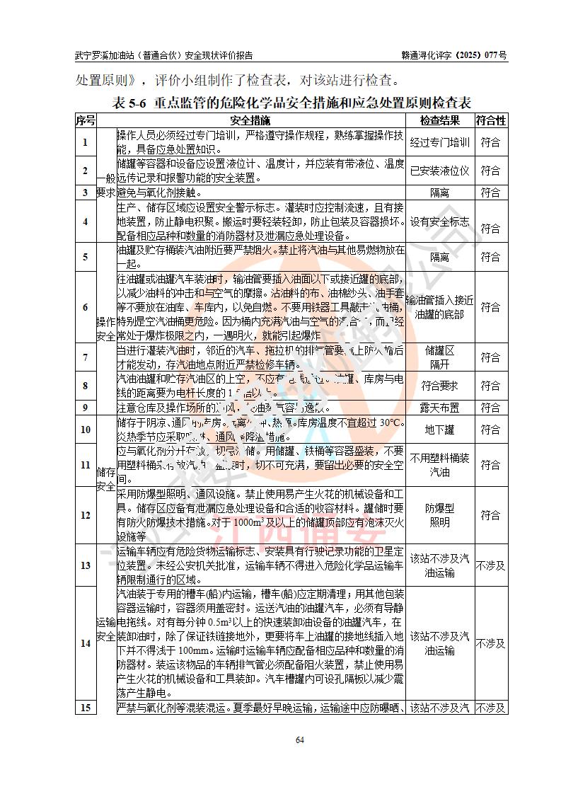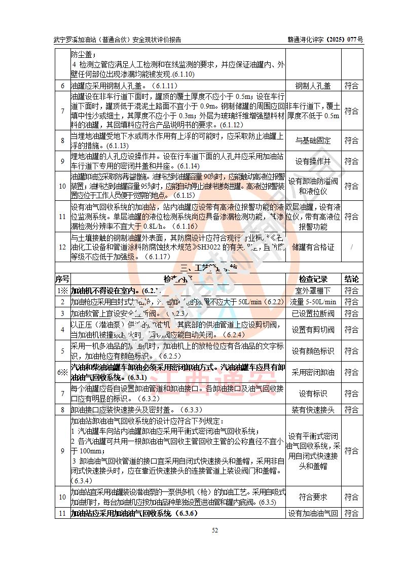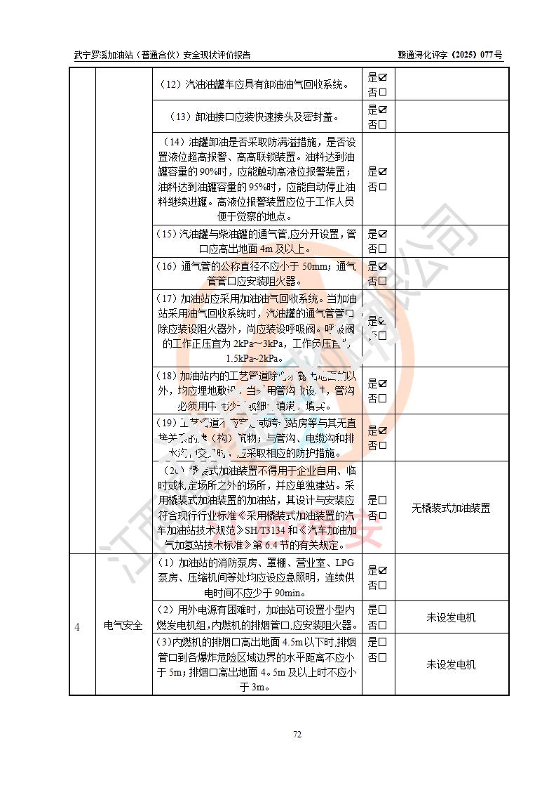 評(píng)價(jià)結(jié)論 | 武寧羅溪加油站(普通合伙)涉及的安全條件、安全經(jīng)營(yíng)條件、安全生產(chǎn)管理符合《危險(xiǎn)化學(xué)品經(jīng)營(yíng)許可證管理辦法》、《汽車加油加氣加氫站技術(shù)標(biāo)準(zhǔn)》等**有關(guān)法規(guī)、標(biāo)準(zhǔn)、規(guī)范要求,能滿足危險(xiǎn)化學(xué)品經(jīng)營(yíng)安全條件。 | |||