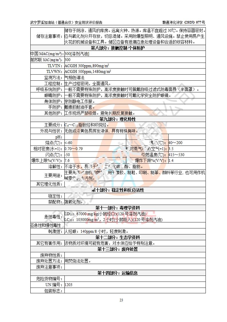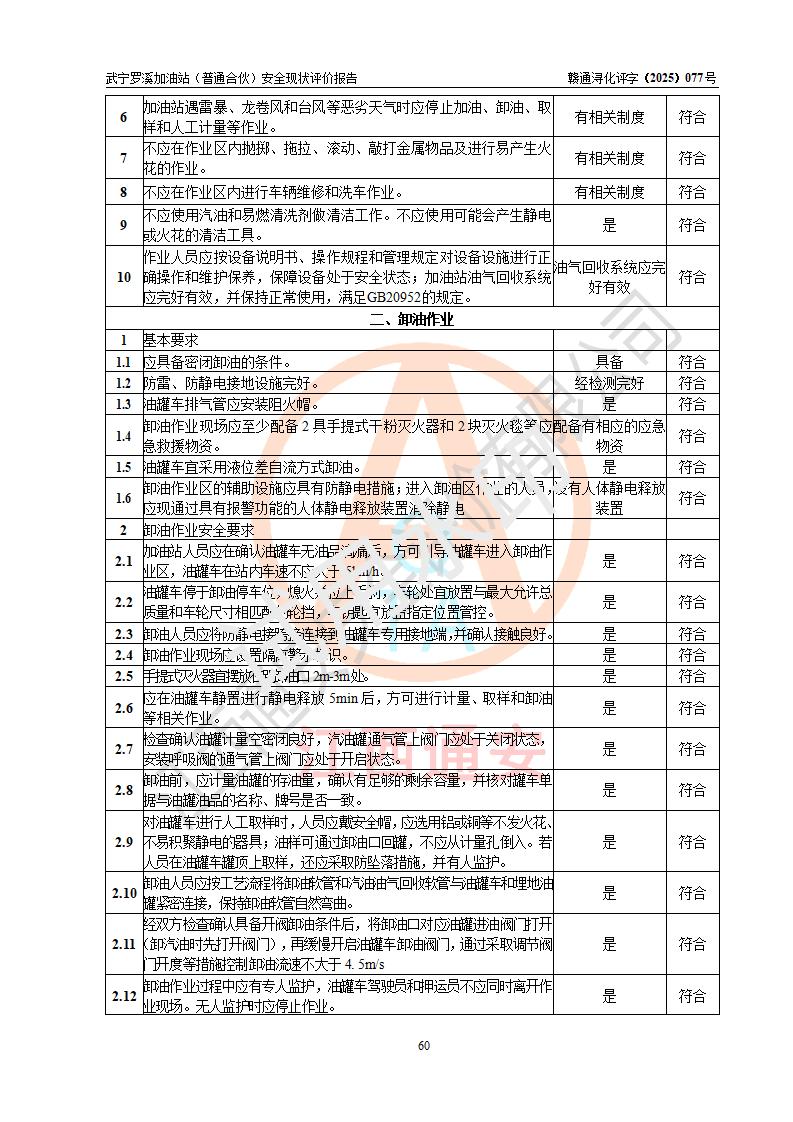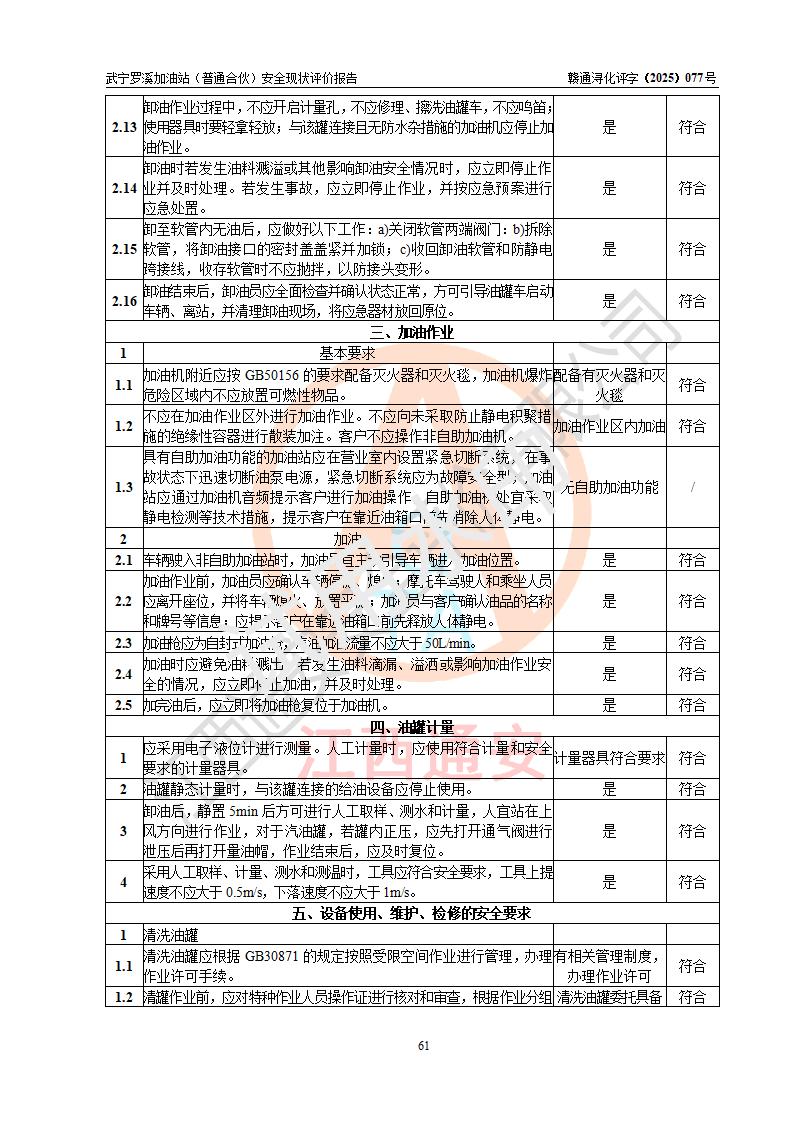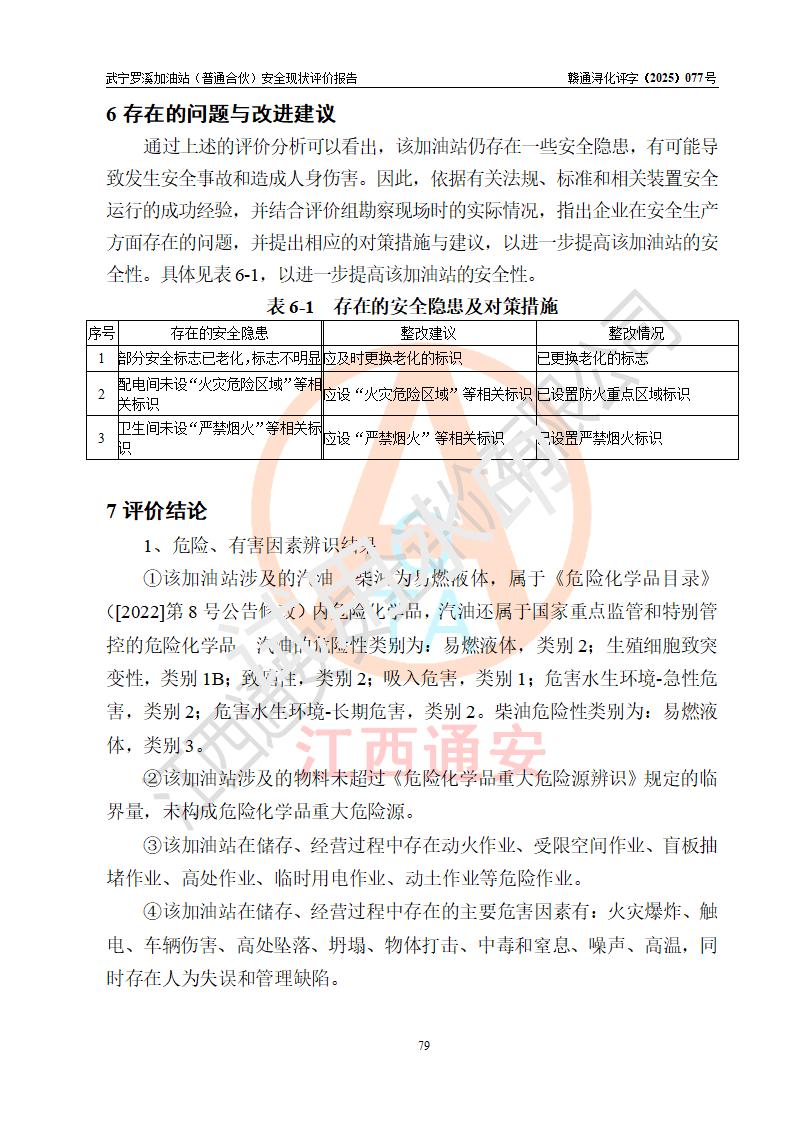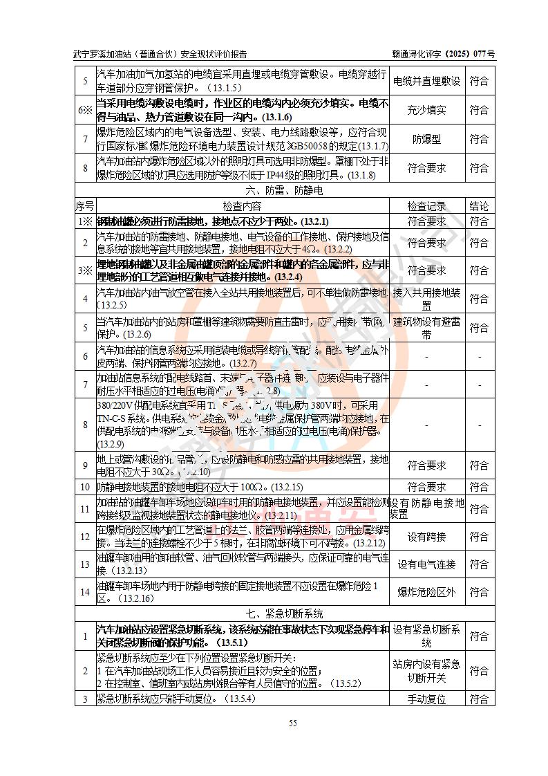 評(píng)價(jià)結(jié)論 | 武寧羅溪加油站(普通合伙)涉及的安全條件、安全經(jīng)營(yíng)條件、安全生產(chǎn)管理符合《危險(xiǎn)化學(xué)品經(jīng)營(yíng)許可證管理辦法》、《汽車加油加氣加氫站技術(shù)標(biāo)準(zhǔn)》等**有關(guān)法規(guī)、標(biāo)準(zhǔn)、規(guī)范要求,能滿足危險(xiǎn)化學(xué)品經(jīng)營(yíng)安全條件。 | |||
