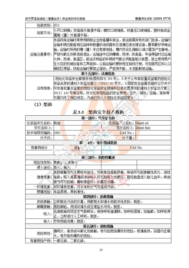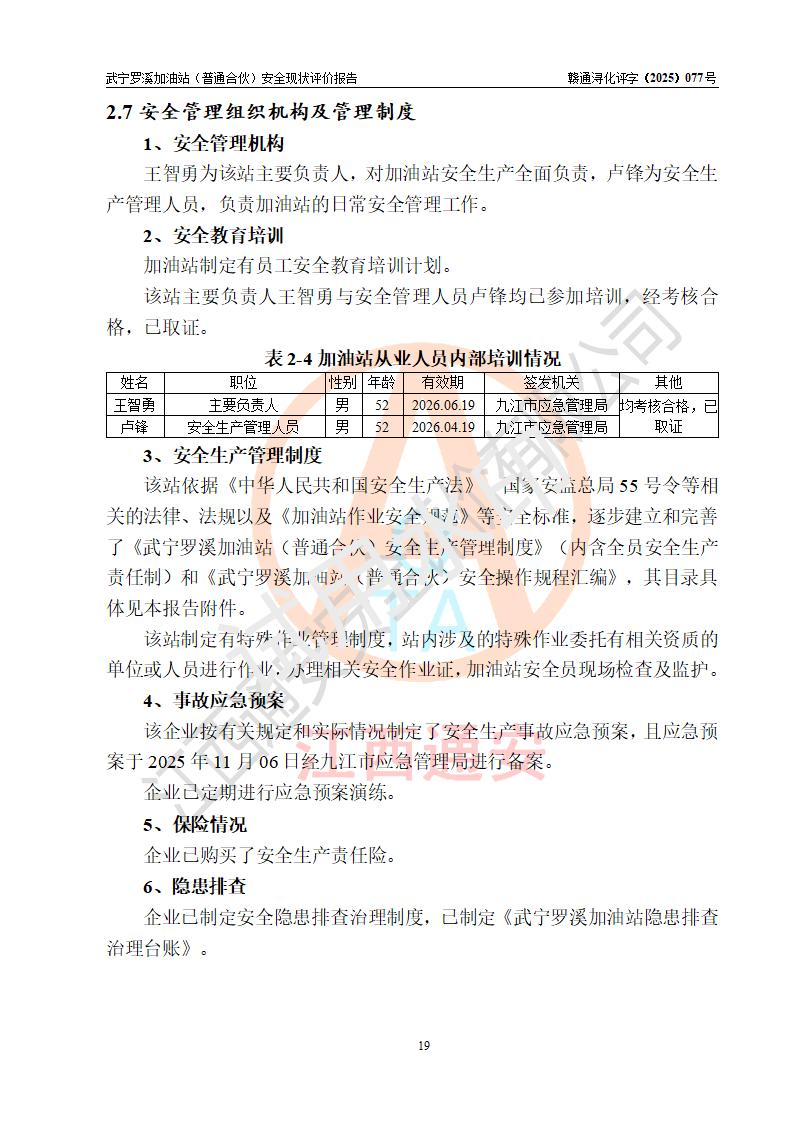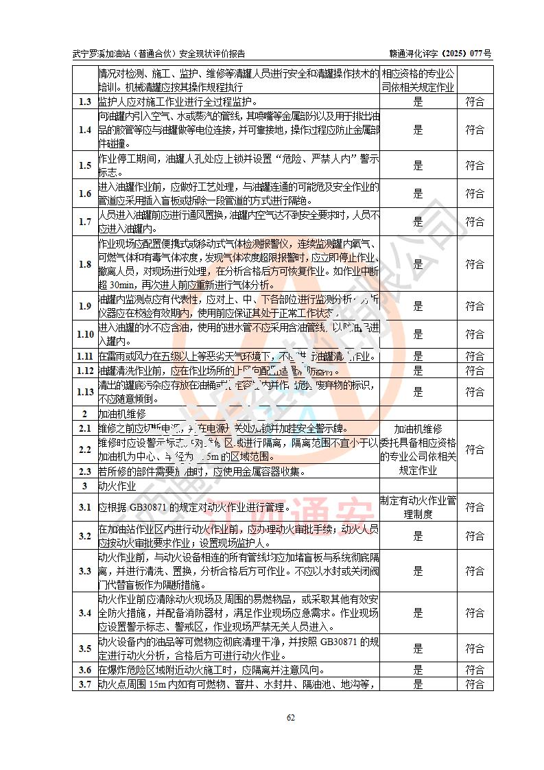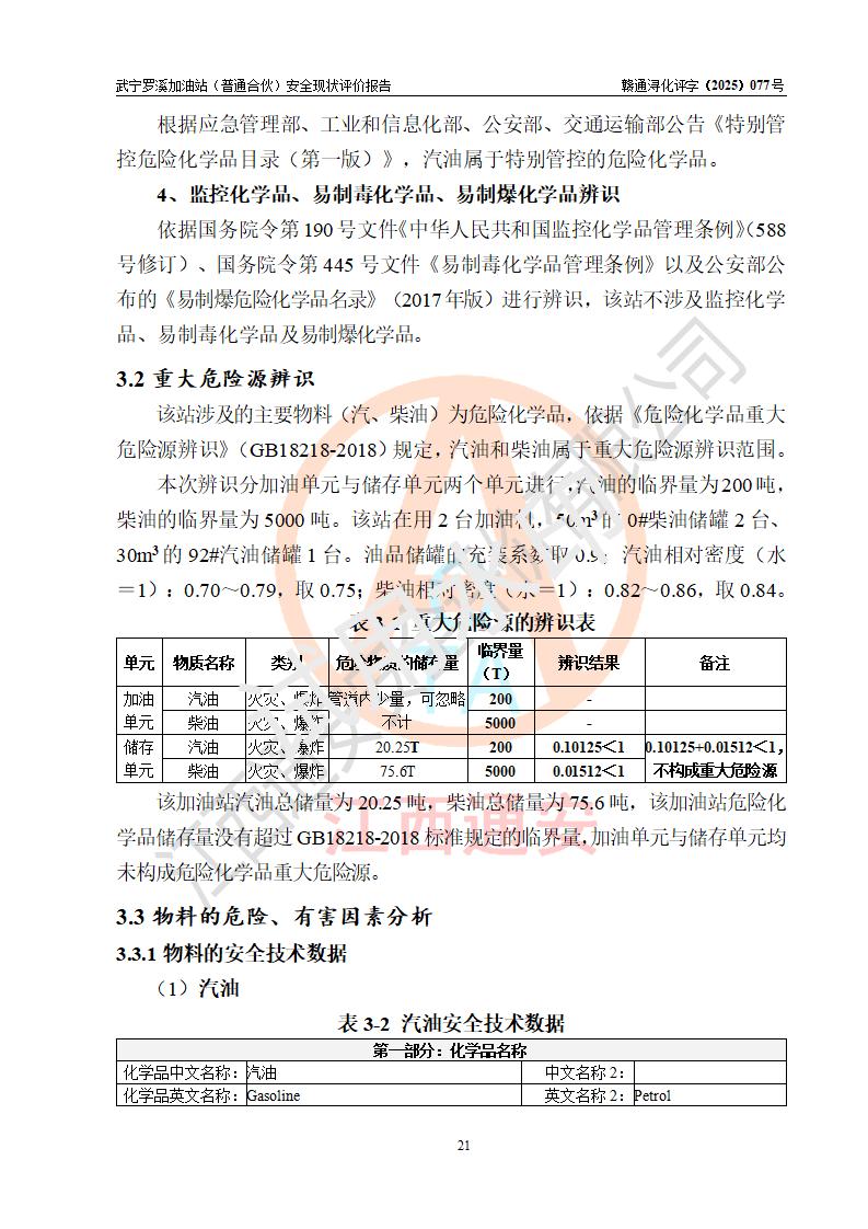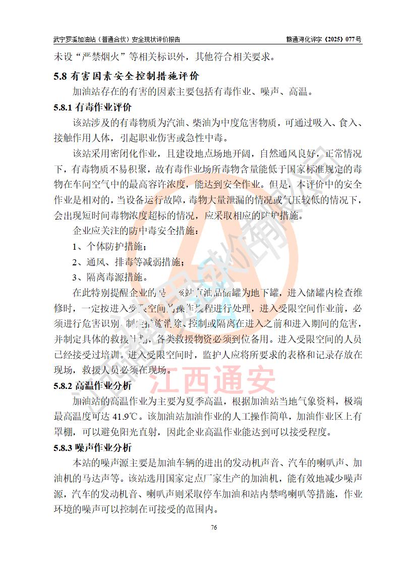 評(píng)價(jià)結(jié)論 | 武寧羅溪加油站(普通合伙)涉及的安全條件、安全經(jīng)營(yíng)條件、安全生產(chǎn)管理符合《危險(xiǎn)化學(xué)品經(jīng)營(yíng)許可證管理辦法》、《汽車加油加氣加氫站技術(shù)標(biāo)準(zhǔn)》等**有關(guān)法規(guī)、標(biāo)準(zhǔn)、規(guī)范要求,能滿足危險(xiǎn)化學(xué)品經(jīng)營(yíng)安全條件。 | |||