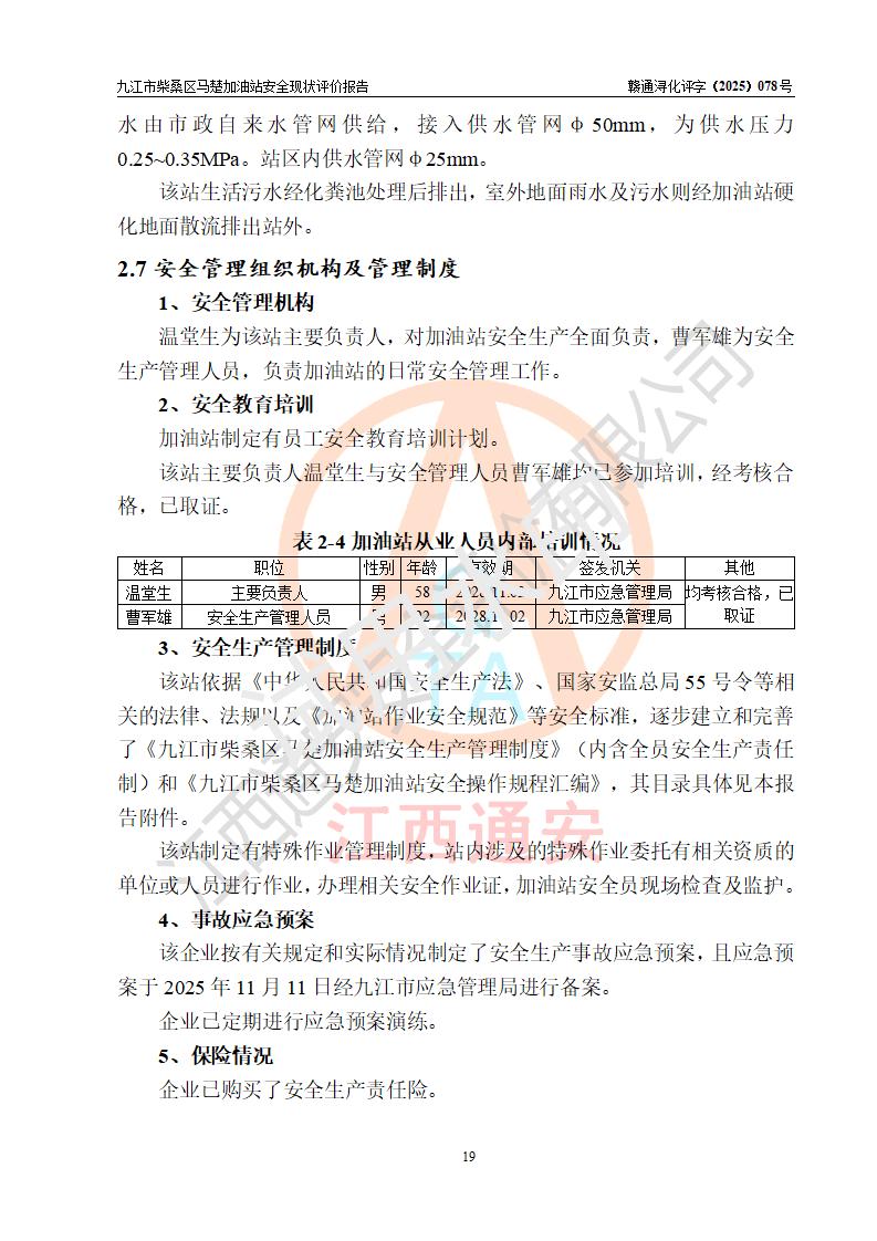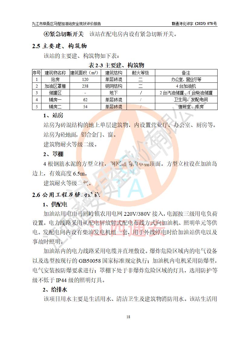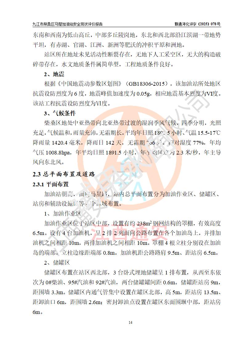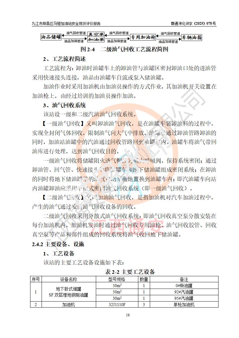 項(xiàng)目簡(jiǎn)介 | 九江市柴桑區(qū)馬楚加油站是一家專(zhuān)門(mén)從事成品油零售經(jīng)營(yíng)的普通合伙企業(yè),經(jīng)營(yíng)場(chǎng)所位于江西省九江市柴桑區(qū)馬回嶺鎮(zhèn)交通路50號(hào)?,F(xiàn)有從業(yè)人員3名,其中安全管理人員1人,加油站負(fù)責(zé)人溫堂生。 該加油站占地面積約1870.8m2,站區(qū)內(nèi)設(shè)置有3臺(tái)單槍和1臺(tái)雙槍程控燃油加油機(jī)及配套的工藝管線(xiàn)、設(shè)有SF雙層儲(chǔ)罐3臺(tái),其中50m3的0#柴油儲(chǔ)罐1臺(tái)、50m3的92#汽油儲(chǔ)罐1臺(tái),30m3的95#汽油儲(chǔ)罐1臺(tái),油品儲(chǔ)罐總?cè)莘e為130m3(折算成汽油為105m3),按現(xiàn)行《汽車(chē)加油加氣加氫站技術(shù)標(biāo)準(zhǔn)》對(duì)加油站的等級(jí)劃分原則,屬二級(jí)加油站。 該站由九江市行政審批局換發(fā)《危險(xiǎn)化學(xué)品經(jīng)營(yíng)許可證》(證號(hào):贛九行審經(jīng)(甲)字[2023]000004號(hào)),**期限2022年12月24日至2025年12月23日。 | |||