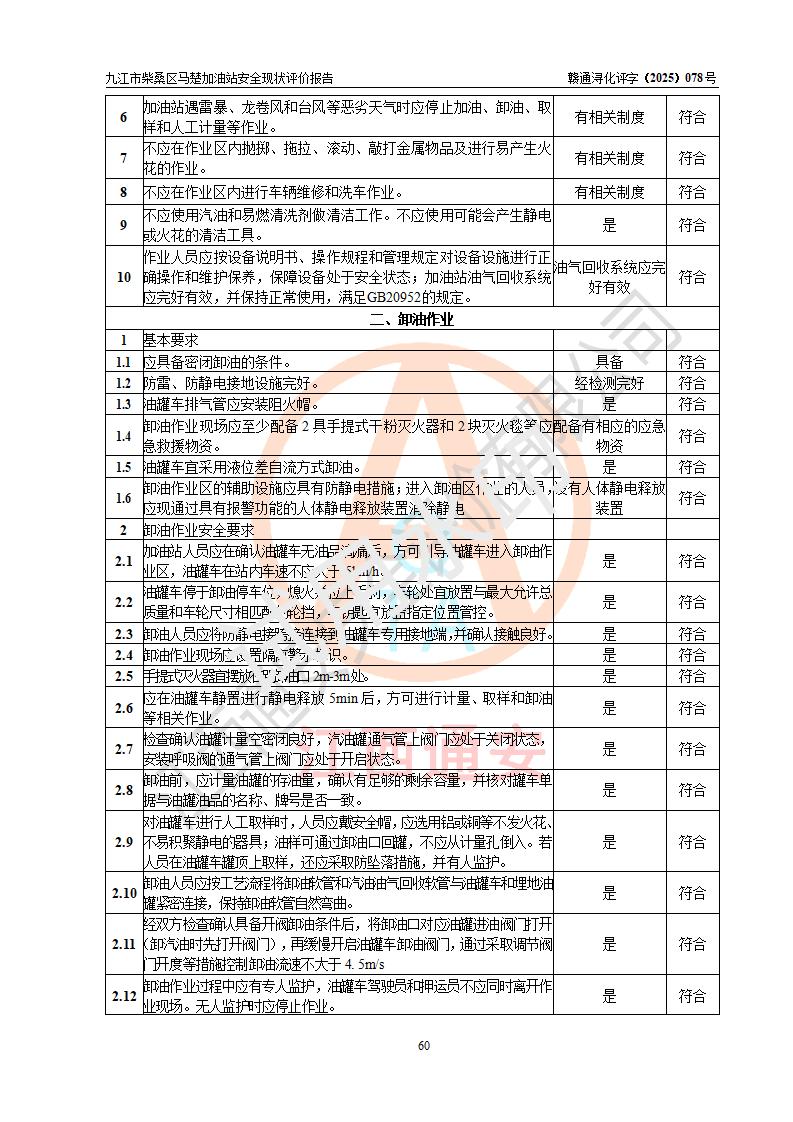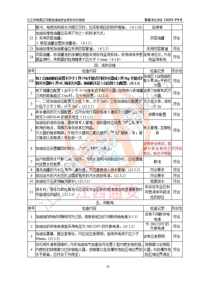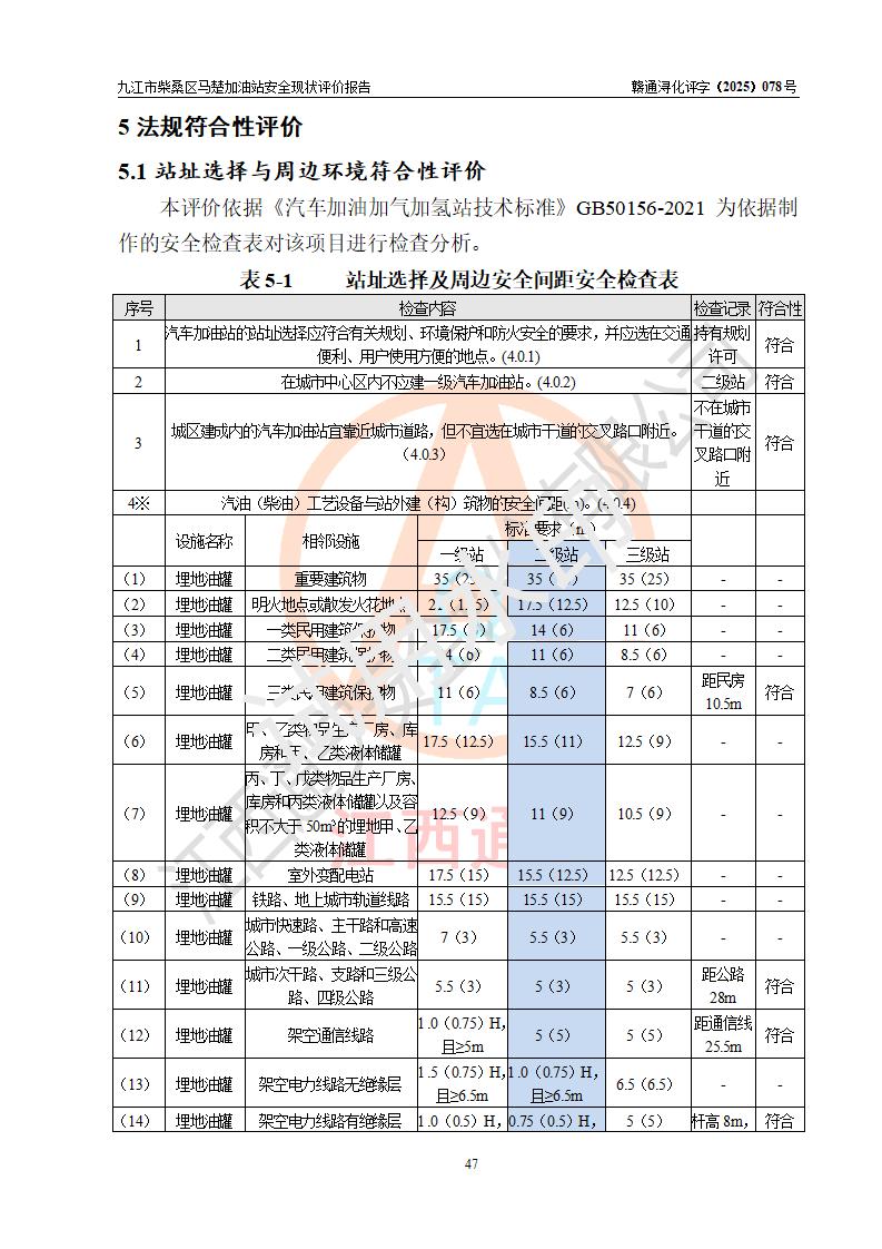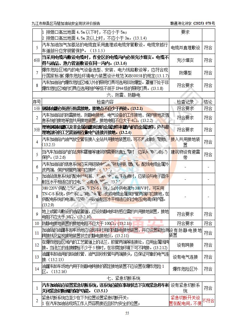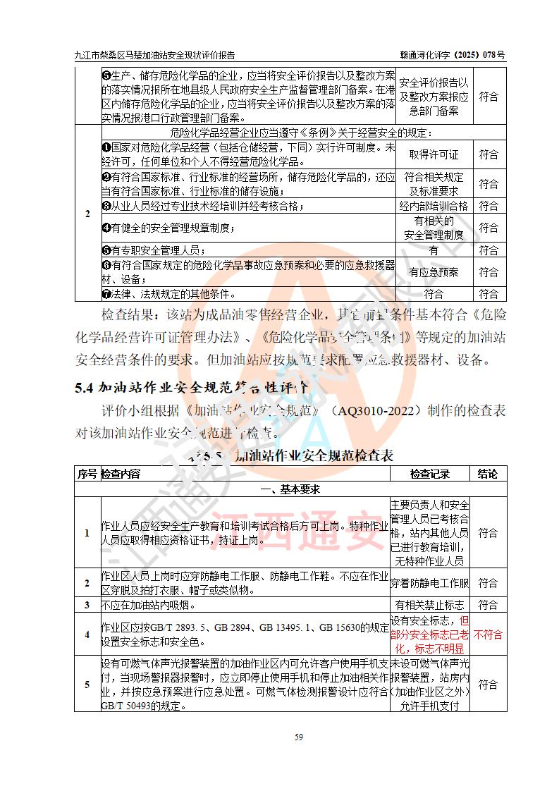 評(píng)價(jià)結(jié)論 | 九江市柴桑區(qū)馬楚加油站涉及的安全條件、安全經(jīng)營(yíng)條件、安全生產(chǎn)管理符合《危險(xiǎn)化學(xué)品經(jīng)營(yíng)許可證管理辦法》、《汽車(chē)加油加氣加氫站技術(shù)標(biāo)準(zhǔn)》等**有關(guān)法規(guī)、標(biāo)準(zhǔn)、規(guī)范要求,能滿(mǎn)足危險(xiǎn)化學(xué)品經(jīng)營(yíng)安全條件。 | |||